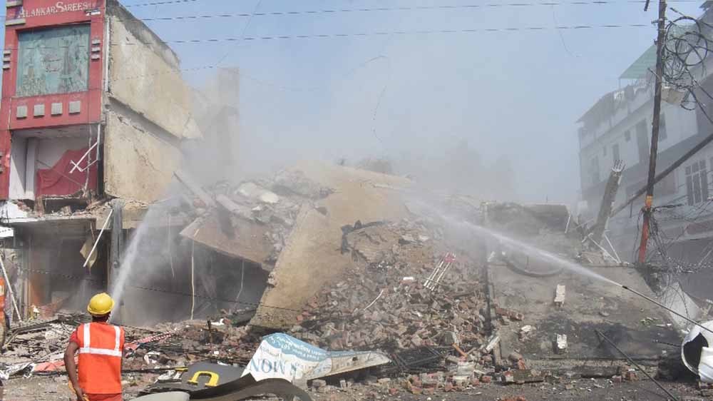 बराबर की अन्य दुकानों और घरों को नुकसान होने की आशंका के चलते अलंकार साड़ीज की तीन मंजिला दुकान को पूरी तरह नहीं गिराया गया।
