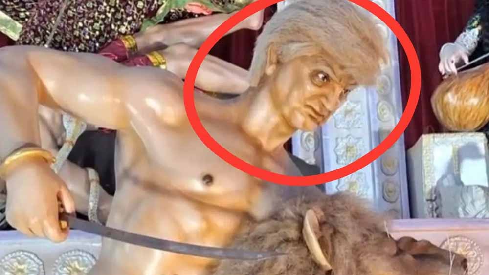 इस पंडाल समिति ने मां दुर्गा के साथ किसी राक्षसी रूप के महिषासुर की नहीं बल्कि ट्रंप की महिषासुर वाली मूर्ति लगाई है, जो काफी वायरल हो रही है। बहरामपुर में खागड़ा क्रेमेटोरियम घाट दुर्गा पूजा समिति ने यह महिषासुर ट्रंप की मूर्ति लगाई है। समिति ने बताया कि ट्रंप ने भारत को धोखा दिया इसलिए उनकी ऐसी मूर्ति लगाई गई है। समिति ने कहा, वह भारत पर लगे 50 प्रतिशत टैरिफ को एक धोखा मानते है। उन्होंने कहा कि, पीएम मोदी ट्रंप को अपना दोस्त मानते थे लेकिन इसके बावजूद उन्होंने टैरिफ के रूप में भारत को धोखा दिया इसलिए यह मूर्ति लगाई गई है।